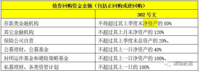 2017年12月29日,央行发布302号文,即《关于规范债券市场参与者债券交易业务的通知》,尝试解决债券交易不规范和加杠杆两个问题,其对债券回购资金的比例进行了明确,具体如下表所示: